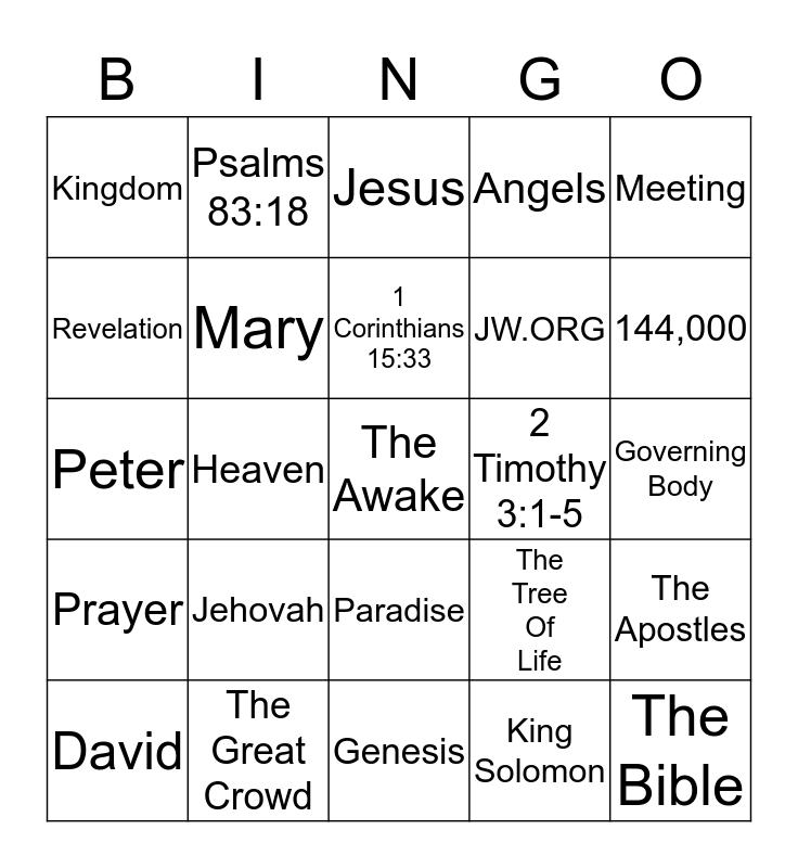 This bingo card has 25 words: Jehovah, Genesis, 1 Corinthians 15:33, David, Meeting, Kingdom, Revelation, Psalms 83:18, 2 Timothy 3:1-5, Paradise, JW.ORG, Peter, The Tree Of Life, The Apostles, Mary, The Bible, Governing Body, Jesus, 144,000, Heaven, The Awake, The Great Crowd, Prayer, Angels and King Solomon.