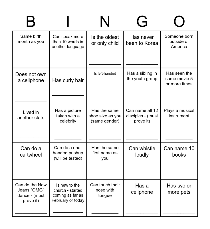 This bingo card has a free space and 24 words: Can do a one- handed pushup (will be tested) _____________, Is new to the church - started coming as far as February or today _____________, Is left-handed _______________, Can do the New Jeans "OMG" dance - (must prove it) _____________, Someone born outside of America _____________, Same birth month as you _____________, Does not own a cellphone ___________, Can speak more than 10 words in another language _____________, Can name all 12 disciples - (must prove it) _____________, Has the same first name as you _____________, Has a sibling in the youth group ___________, Lived in another state ____________, Can whistle loudly ___________, Can name 10 books ___________, Has curly hair ___________, Has a cellphone ___________, Plays a musical instrument ___________, Is the oldest or only child ___________, Has seen the same movie 5 or more times ___________, Has a picture taken with a celebrity ___________, Has two or more pets ___________, Can do a cartwheel ___________, Has never been to Korea ___________ and Can touch their nose with tongue ___________.