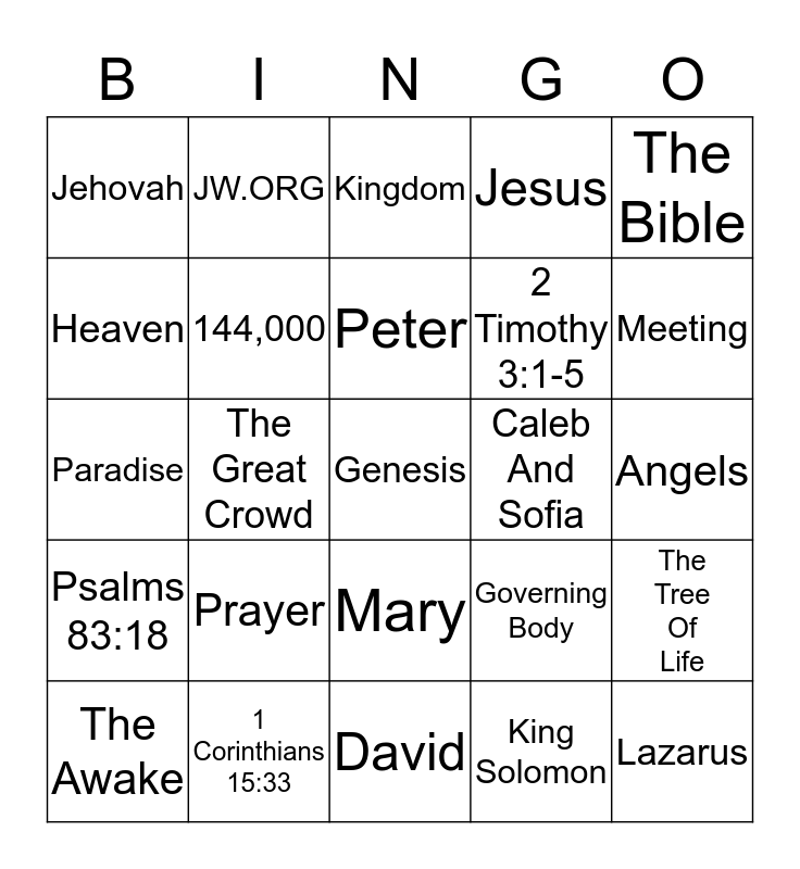 This bingo card has 25 words: Prayer, David, Peter, The Awake, The Bible, Jehovah, Heaven, JW.ORG, Caleb And Sofia, Mary, 2 Timothy 3:1-5, Paradise, Governing Body, The Tree Of Life, 144,000, Lazarus, Angels, Kingdom, Meeting, The Great Crowd, Genesis, 1 Corinthians 15:33, Psalms 83:18, Jesus and King Solomon.
