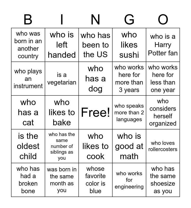 This bingo card has a free space and 24 words: who has the same number of siblings as you, was born in the same month as you, who has a dog, who has had a broken bone, who is a Harry Potter fan, who was born in an another country, who plays an instrument, who is left handed, who speaks more than 2 languages, who likes to cook, who works here for more than 3 years, who has a cat, who is good at math, who loves rollercosters, is a vegetarian, who works for engineering, who considers herself organized, who has been to the US, who works here for less than one year, who likes to bake, who has the same shoesize as you, is the oldest child, who likes sushi and whose favorite color is blue.