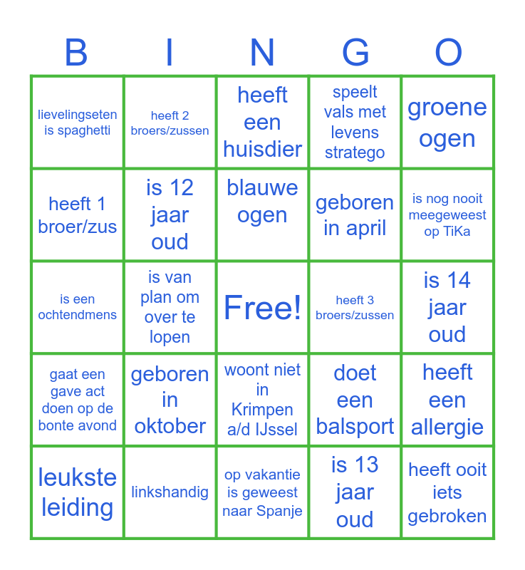 This bingo card has a free space and 24 words: geboren in oktober, linkshandig, blauwe ogen, leukste leiding, groene ogen, lievelingseten is spaghetti, heeft 1 broer/zus, heeft 2 broers/zussen, heeft 3 broers/zussen, woont niet in Krimpen a/d IJssel, geboren in april, is een ochtendmens, doet een balsport, heeft een allergie, is 12 jaar oud, is 13 jaar oud, is 14 jaar oud, heeft een huisdier, is nog nooit meegeweest op TiKa, is van plan om over te lopen, heeft ooit iets gebroken, gaat een gave act doen op de bonte avond, speelt vals met levens stratego and op vakantie is geweest naar Spanje.