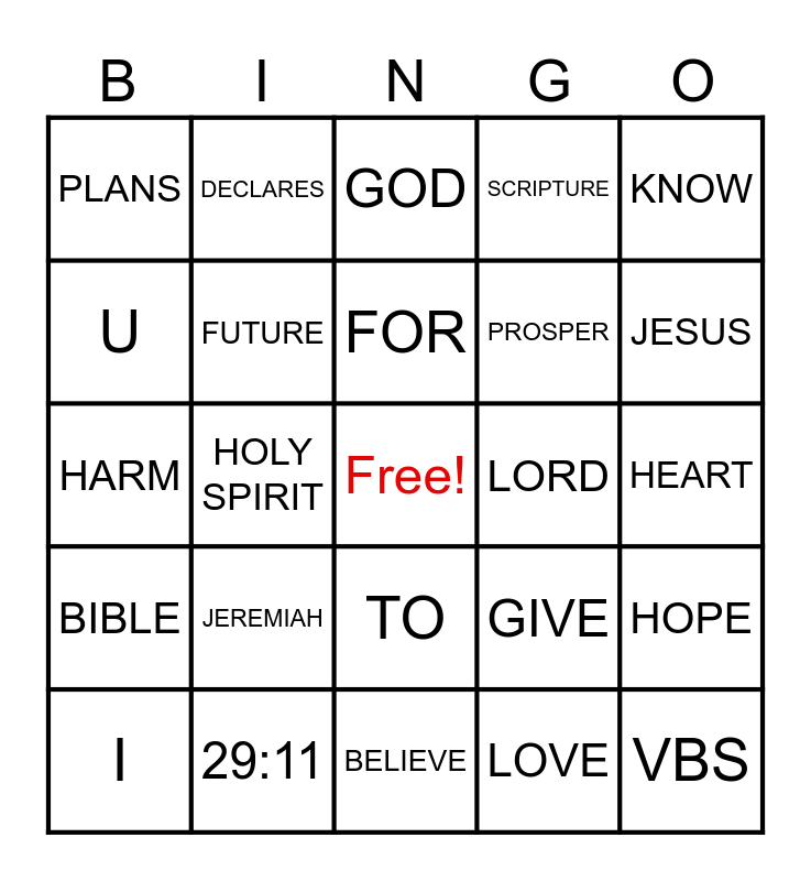 This bingo card has a free space and 24 words: JEREMIAH, 29:11, FOR, I, KNOW, PLANS, U, DECLARES, LORD, TO, PROSPER, HARM, GIVE, HOPE, FUTURE, LOVE, HEART, GOD, JESUS, HOLY SPIRIT, VBS, BIBLE, SCRIPTURE and BELIEVE.