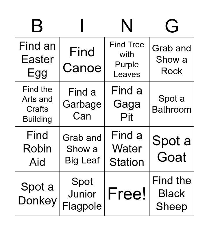 This bingo card has 17 words: Free!, Spot a Donkey, Find Tree with Purple Leaves, Find an Easter Egg, Grab and Show a Big Leaf, Grab and Show a Rock, Spot a Goat, Find a Gaga Pit, Spot a Bathroom, Find a Garbage Can, Spot Junior Flagpole, Find a Water Station, Find the Arts and Crafts Building, Find Canoe, Find Robin Aid, Spot the Program Chalet and Find the Black Sheep.