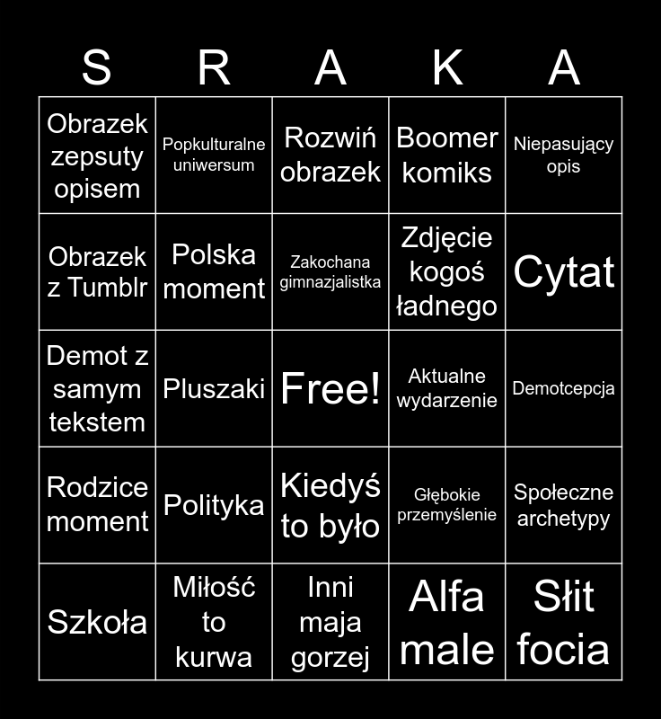 This bingo card has a free space and 24 words: Polityka, Miłość to kurwa, Zakochana gimnazjalistka, Szkoła, Niepasujący opis, Obrazek zepsuty opisem, Obrazek z Tumblr, Popkulturalne uniwersum, Aktualne wydarzenie, Kiedyś to było, Zdjęcie kogoś ładnego, Demot z samym tekstem, Głębokie przemyślenie, Społeczne archetypy, Polska moment, Alfa male, Demotcepcja, Rozwiń obrazek, Cytat, Pluszaki, Słit focia, Rodzice moment, Boomer komiks and Inni maja gorzej.