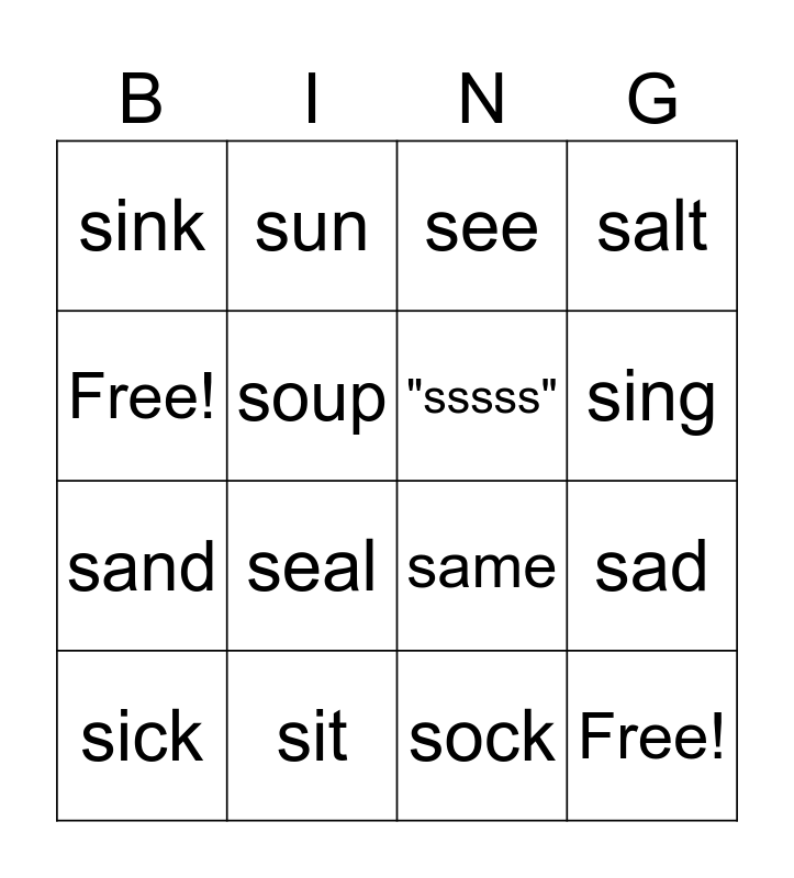 This bingo card has 16 words: sit, sad, see, sink, sand, sun, same, sock, Free!, soup, sick, salt, seal, sing, "sssss" and Free!.