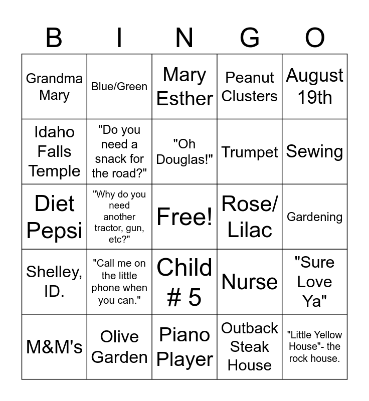This bingo card has a free space and 27 words: Nurse, March 19th, Trumpet, Piano Player, Idaho Falls Temple, Mary Esther, Blue/Green, Shelley, ID., Rose/ Lilac, "Sure Love Ya", Diet Pepsi, Peanut Clusters, M&M's, Olive Garden, Sewing, Quilter, "Do you need a snack for the road?", "Oh Douglas!", "Call me on the little phone when you can.", Grandma Mary, Gardening, Outback Steak House, "Why do you need another tractor, gun, etc?", "Little Yellow House"- the rock house., Child # 5, August 19th and Teddy Bears.
