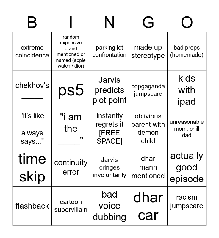 This bingo card has a free space and 34 words: dhar mann voiceover, dhar car, "you see" / "so you see", merch in video, time skip, ps5, bad props (homemade), flashback, random expensive brand mentioned or named (apple watch / dior), dhar mann studios office in the video, Jarvis predicts plot point, parking lot confrontation, spaghetti, creep behavior, oblivious parent with demon child, kids with ipad, cartoon supervillain, "it's like ____ always says...", continuity error, dhar mann mentioned, Jarvis cringes involuntarily, someone fired over something small, extreme coincidence, unreasonable mom, chill dad, bad voice dubbing, racism jumpscare, made up stereotype, unreasonably calm, copgaganda jumpscare, chekhov's _____, alliteration nicknames, "i am the ____", actually good episode and semi-complicit sibling.