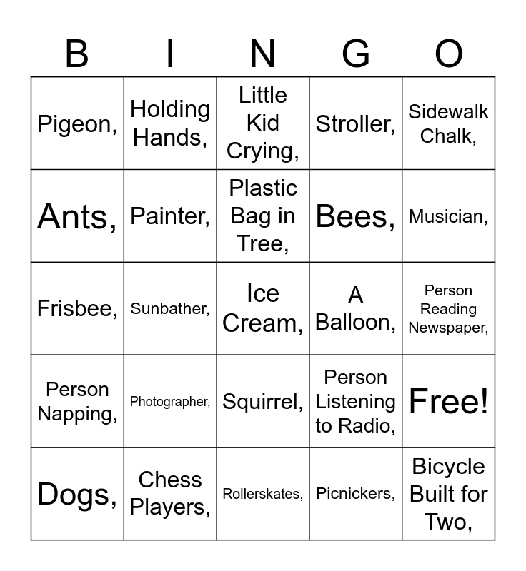 This bingo card has 28 words: Free!, Flowers,, Bees,, Picnickers,, Ants,, Little Kid Crying,, Holding Hands,, Person Napping,, A Balloon,, Dogs,, Frisbee,, Stroller,, Chess Players,, Rollerskates,, Musician,, Juggler,, Photographer,, Painter,, Plastic Bag in Tree,, Squirrel,, Pigeon,, Bicycle Built for Two,, Ice Cream,, Sunbather,, Person Reading Newspaper,, Person Listening to Radio,, Sidewalk Chalk, and Hopscotch.