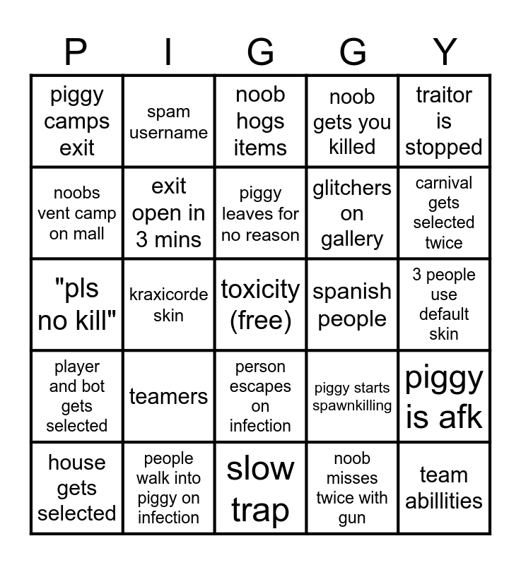 This bingo card has a free space and 24 words: house gets selected, teamers, piggy leaves for no reason, noob misses twice with gun, traitor is stopped, piggy camps exit, spam username, noob hogs items, spanish people, 3 people use default skin, "pls no kill", exit open in 3 mins, piggy starts spawnkilling, piggy is afk, noobs vent camp on mall, people walk into piggy on infection, slow trap, noob gets you killed, carnival gets selected twice, player and bot gets selected, kraxicorde skin, person escapes on infection, glitchers on gallery and team abillities.