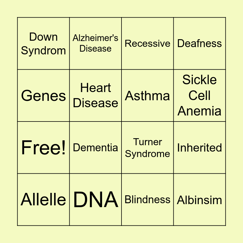 This bingo card has 20 words: Inherited, Punnett Square, Recessive, Dominant, Allelle, Genes, DNA, Down Syndrom, Free!, Alzheimer's Disease, Dementia, Turner Syndrome, Heart Disease, Albinsim, Asthma, Cystic Fibrosis, Sickle Cell Anemia, Deafness, Blindness and Spina Bifida.