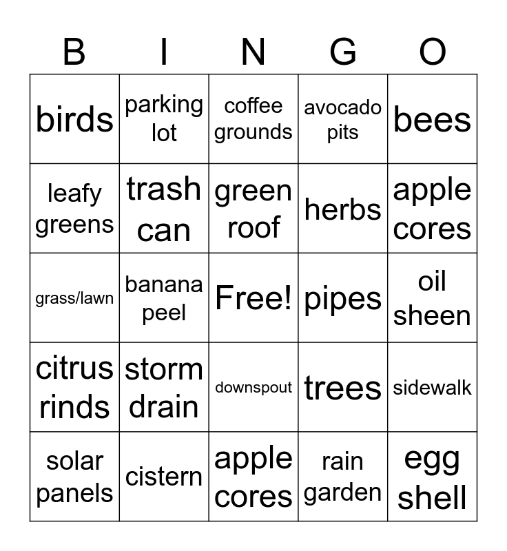 This bingo card has a free space and 24 words: storm drain, cistern, green roof, solar panels, bees, birds, leafy greens, parking lot, pipes, downspout, herbs, grass/lawn, trees, sidewalk, trash can, rain garden, oil sheen, coffee grounds, apple cores, banana peel, egg shell, citrus rinds, avocado pits and apple cores.