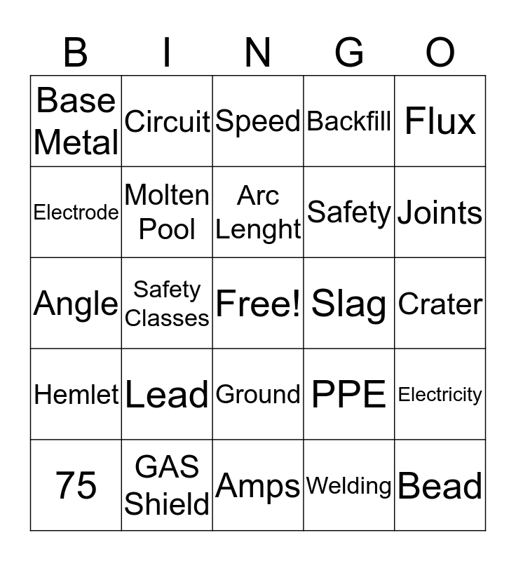 This bingo card has a free space and 24 words: Lead, GAS Shield, Arc Lenght, 75, Flux, Base Metal, Electrode, Circuit, Slag, Ground, Safety, Angle, PPE, Electricity, Molten Pool, Welding, Crater, Speed, Joints, Safety Classes, Bead, Hemlet, Backfill and Amps.