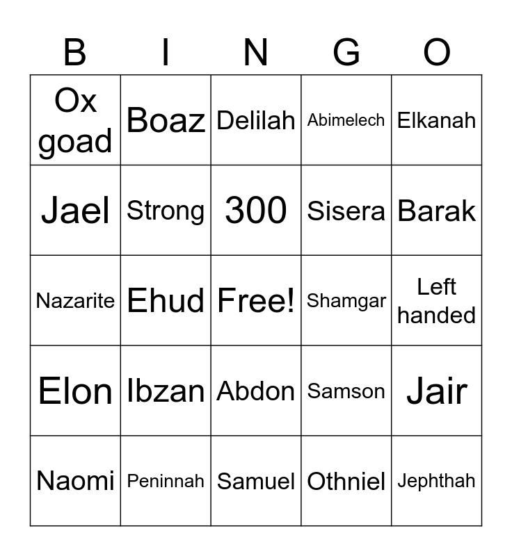 This bingo card has a free space and 31 words: Samuel, Gideon, Ehud, Deborah, Ox goad, Delilah, Strong, Samson, Shamgar, Othniel, Left handed, Jephthah, Eli, Hannah, Barak, Tola, Jair, Ibzan, Elon, Abdon, Elkanah, Ruth, Naomi, Boaz, Sisera, Jael, Abimelech, Nazarite, Peninnah, 300 and Philistines.