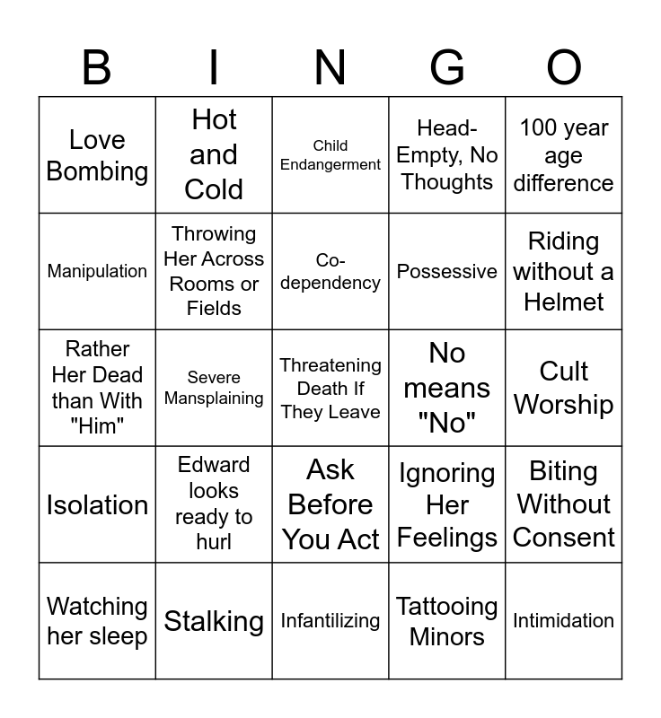 This bingo card has a free space and 24 words: Edward looks ready to hurl, Stalking, Co-dependency, Watching her sleep, 100 year age difference, Love Bombing, Manipulation, Hot and Cold, No means "No", Ask Before You Act, Possessive, Rather Her Dead than With "Him", Ignoring Her Feelings, Biting Without Consent, Throwing Her Across Rooms or Fields, Tattooing Minors, Cult Worship, Child Endangerment, Riding without a Helmet, Severe Mansplaining, Intimidation, Isolation, Head-Empty, No Thoughts and Infantilizing.