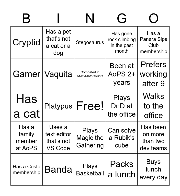 This bingo card has a free space and 30 words: Banda, Alpaca, Platypus, Ocelot, Cryptid, Stegosaurus, Vaquita, Plays Magic the Gathering, Plays DnD at the office, Plays Basketball, Walks to the office, Buys lunch every day, Packs a lunch, Prefers working before 9, Prefers working after 9, Speaks a language that no one else on the dev team does, Can solve a Rubik’s cube, Has a family member at AoPS, Uses a text editor that’s not VS Code, Has a Panera Sips Club membership, Has a cat, Has a dog, Has a pet that’s not a cat or a dog, Been at AoPS 2+ years, Gamer, Has gone rock climbing in the past month, Has been on more than two dev teams, Has a Costo membership, Competed in AMC/MathCounts and Plays an instrument.