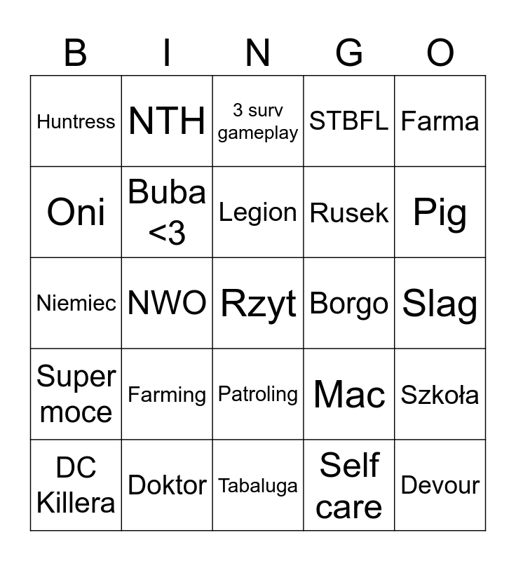 This bingo card has a free space and 24 words: Farming, Doktor, Legion, DC Killera, Farma, Huntress, Oni, NTH, Borgo, Patroling, Rusek, Niemiec, Mac, Szkoła, Buba <3, Self care, Slag, 3 surv gameplay, Pig, NWO, Devour, Super moce, STBFL and Tabaluga.