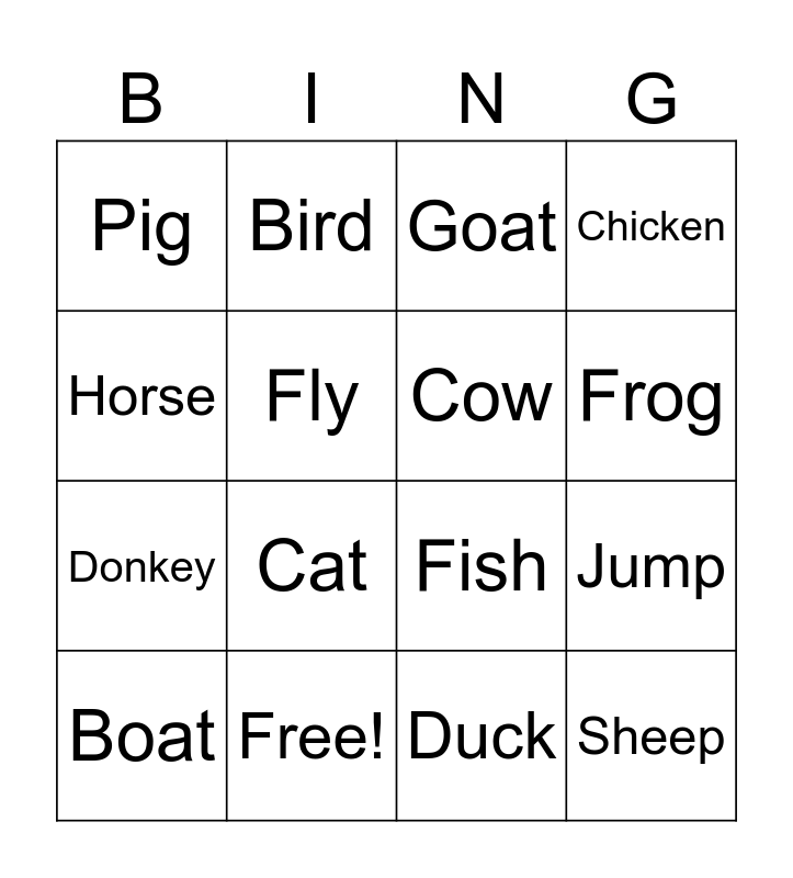 This bingo card has 21 words: Free!, Mouse, Bird, Sing, Duck, Cow, Pig, Goat, Fish, Frog, Donkey, Chicken, Sheep, Swim, Fly, Dog, Boat, Cat, Horse, Jump and Run.