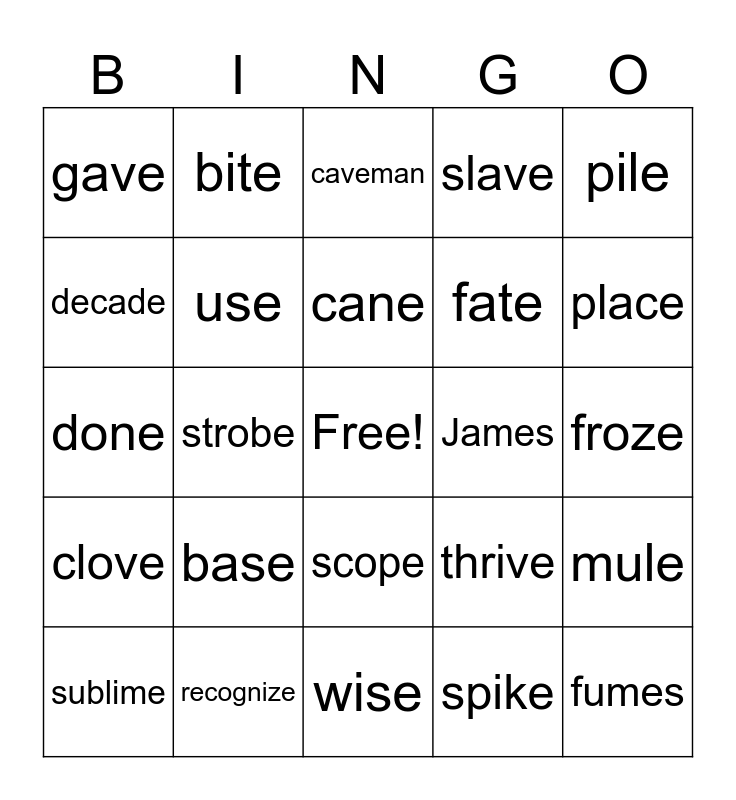 This bingo card has a free space and 24 words: base, recognize, cane, sublime, pile, gave, decade, bite, James, scope, fate, done, thrive, mule, use, spike, froze, caveman, place, strobe, fumes, clove, slave and wise.