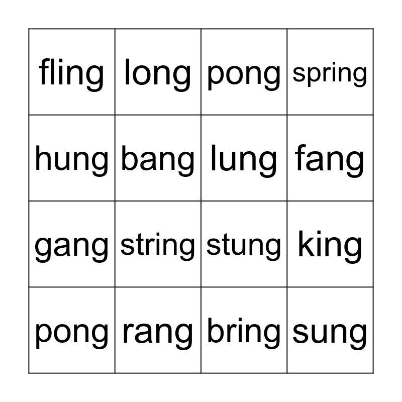 This bingo card has 24 words: sting, song, fang, hang, hung, fling, bang, long, rang, thing, gang, stung, swing, cling, lung, slang, bring, pong, string, king, pong, sung, spring and strong.