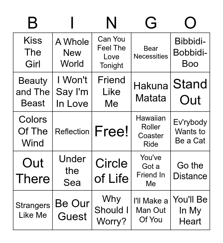 This bingo card has a free space and 24 words: Under the Sea, Be Our Guest, Friend Like Me, Strangers Like Me, Bibbidi-Bobbidi-Boo, Kiss The Girl, Beauty and The Beast, A Whole New World, Hawaiian Roller Coaster Ride, Circle of Life, Hakuna Matata, Colors Of The Wind, You've Got a Friend In Me, Go the Distance, I Won't Say I'm In Love, I'll Make a Man Out Of You, Ev'rybody Wants to Be a Cat, Can You Feel The Love Tonight, Stand Out, Reflection, You'll Be In My Heart, Out There, Bear Necessities and Why Should I Worry?.