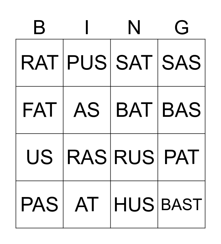 This bingo card has 16 words: AT, PAT, SAT, RAT, US, PUS, RUS, HUS, FAT, AS, PAS, SAS, RAS, BAS, BAT and BAST.