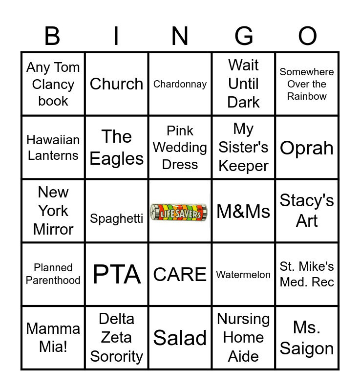 This bingo card has a free space and 56 words: Sophie's Choice, Mamma Mia!, Tina Turner, Any Tom Clancy book, Salad, The Right Stuff, The Eagles, Unchained Melody, My Sister's Keeper, 72% Dark Chocolate, Wait Until Dark, The Bee Gees, How to be an Anti-Racist, Pepsi, The Blues Brothers, Elvis, Somewhere Over the Rainbow, Spaghetti, Cosmopolitan, Ms. Saigon, M&Ms, Our Bodies, Ourselves, Watermelon, Chardonnay, Hot Pink, Pink Wedding Dress, Aloha, Pau, Oprah, Barack & Michele, The Clintons, Maui, Vietnam, California, Stacy's Art, Hawaiian Lanterns, New York Mirror, Chinese Furniture, Planned Parenthood, Church, CARE, Glaucoma Foundation, Giving it Back, Job's Daughters, Brown Deer Junior Women's Club, PTA, Delta Zeta Sorority, Bowling League, Babysitter, Andes Candies, Nursing Home Aide, Lutheran Hospital, Recycling, Penneys, St. Mike's Med. Rec and Kihei Canoe Club.