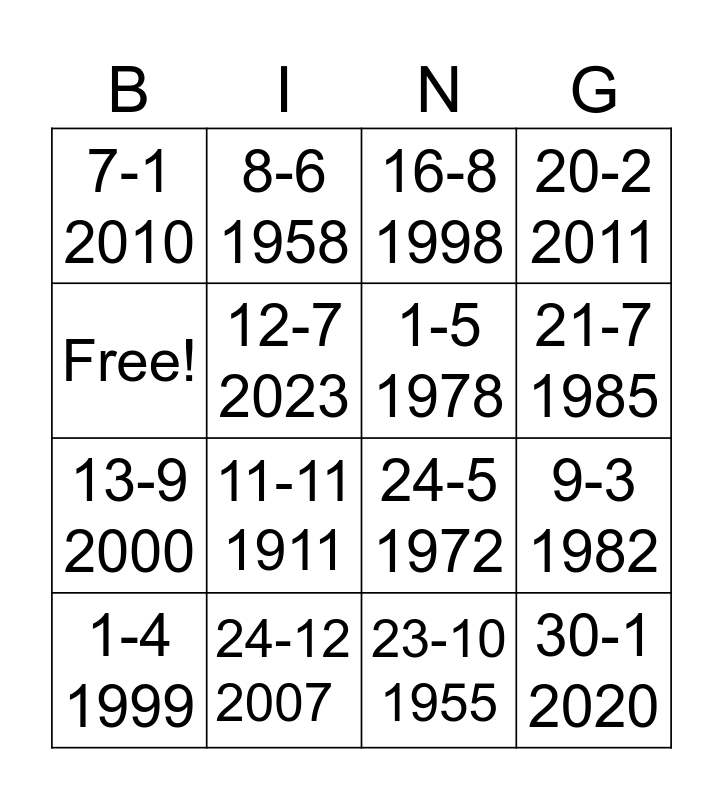 This bingo card has 16 words: 24-12 2007, 9-3 1982, 16-8 1998, 7-1 2010, 13-9 2000, 8-6 1958, 24-5 1972, 23-10 1955, Free!, 12-7 2023, 1-4 1999, 20-2 2011, 11-11 1911, 21-7 1985, 1-5 1978 and 30-1 2020.