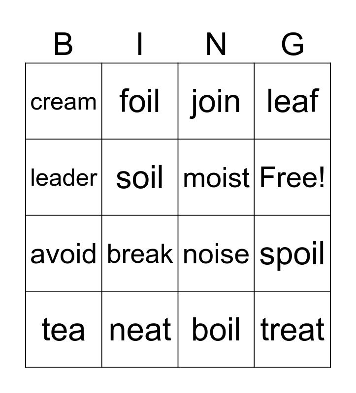 This bingo card has 17 words: boil, tea, join, cream, break, leaf, spoil, moist, Free!, soil, neat, noise, leader, foil, avoid, please and treat.