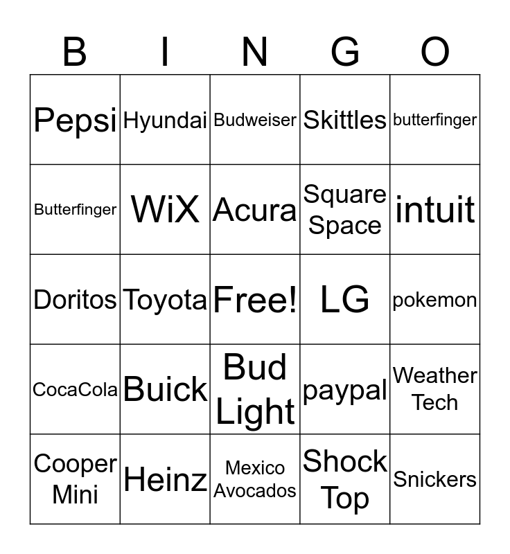 This bingo card has a free space and 28 words: Weather Tech, Honda, Square Space, Shock Top, Butterfinger, Budweiser, Hyundai, CocaCola, LG, Cooper Mini, Doritos, Skittles, Heinz, Mexico Avocados, intuit, Sun Trust Bank, Buick, WiX, Acura, Bud Light, Pepsi, Taco Bell, Snickers, Toyota, pokemon, paypal, butterfinger and turbotax.