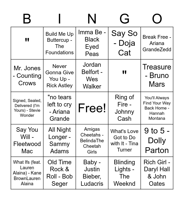 This bingo card has a free space and 63 words: Pocketful of Sunshine - Natasha Bedingfield, Breakfast At Tiffany's - by Deep Blue Something, Iris - The Goo Goo Dolls, 9 to 5 - Dolly Parton, Mirrors b - Justin Timberlake, Hotline Bling - Drake, Build Me Up Buttercup - The Foundations, Bring It On Home to Me - Sam Cooke, Jordan Belfort - Wes Walker, Shape of You - Ed Sheeran, Amigas Cheetahs - BelindaThe Cheetah Girls, Dani California - Red Hot Chili Peppers, You'll Always Find Your Way Back Home - Hannah Montana, Break Free - Ariana GrandeZedd, My Humps - Black Eyed Peas, Mr. Jones - Counting Crows, "no tears left to cry - Ariana Grande, ", "Forever - Chris Brown, ", All Night Longer - Sammy Adams, Say You Will - Fleetwood Mac, Say So - Doja Cat, I'm Coming Out - Diana Ross, How Will I Know - Whitney Houston, You Shook Me All Night Long - AC/DC, Dancing Queen - ABBA, Love Story (Taylor’s Version) - Taylor Swift, Shake It Off - Taylor Swift, Accidentally In Love - From "Shrek 2" - Counting Crows, Despacito Remix - Daddy Yankee, Justin Bieber, I Will Survive - Single Version - Gloria Gaynor, Feel It Still - Portugal. The Man, Thunder - Imagine Dragons, Treasure - Bruno Mars, What Ifs (feat. Lauren Alaina) - Kane BrownLauren Alaina, Boogie Wonderland - Earth, Wind & Fire, The Emotions, Blinding Lights - The Weeknd, I Gotta Feeling - Black Eyed Peas, Never Gonna Give You Up - Rick Astley, Signed, Sealed, Delivered (I'm Yours) - Stevie Wonder, Ring of Fire - Johnny Cash, Low (feat. T-Pain) - Flo RidaT-Pain, Promiscuous - Nelly Furtado, Timbaland, Rich Girl - Daryl Hall & John Oates, Old Time Rock & Roll - Bob Seger, I Want You Back - The Jackson 5, What's Love Got to Do with It - Tina Turner, Billie Jean - Jeremy Lubbock, Michael Jackson, It's Raining Men - The Weather Girls, Wake Me up When September Ends - Green Day, Baby - Justin Bieber, Ludacris, Brick House - Commodores, Walk Like an Egyptian - The Bangles, I Got You (I Feel Good) - James Brown & The Famous Flames, Imma Be - Black Eyed Peas, Shut Up and Dance - WALK THE MOON, Since U Been Gone - Kelly Clarkson, Teenage Dream - Katy Perry, Whatta Man - En Vogue, Salt-N-Pepa, Shape of My Heart - Backstreet Boys, Bye Bye Bye - *NSYNC and Moves Like Jagger - Christina Aguilera, Maroon 5.