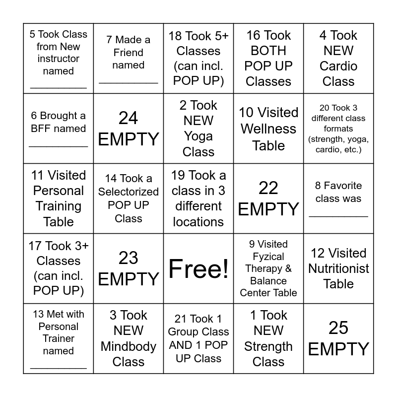 This bingo card has 26 words: Free!, 1 Took NEW Strength Class, 2 Took NEW Yoga Class, 3 Took NEW Mindbody Class, 4 Took NEW Cardio Class, 5 Took Class from New instructor named __________, 6 Brought a BFF named __________, 7 Made a Friend named __________, 8 Favorite class was __________, 9 Visited Fyzical Therapy & Balance Center Table, 10 Visited Wellness Table, 11 Visited Personal Training Table, 12 Visited Nutritionist Table, 13 Met with Personal Trainer named __________, 14 Took a Selectorized POP UP Class, 15 Took a Sprint 8 POP UP Class, 16 Took BOTH POP UP Classes, 17 Took 3+ Classes (can incl. POP UP), 18 Took 5+ Classes (can incl. POP UP), 19 Took a class in 3 different locations, 20 Took 3 different class formats (strength, yoga, cardio, etc.), 21 Took 1 Group Class AND 1 POP UP Class, 22 EMPTY, 23 EMPTY, 24 EMPTY and 25 EMPTY.