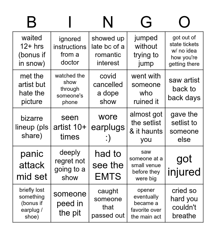 This bingo card has a free space and 24 words: deeply regret not going to a show, someone peed in the pit, covid cancelled a dope show, briefly lost something (bonus if earplug / shoe), got out of state tickets w/ no idea how you're getting there, waited 12+ hrs (bonus if in snow), met the artist but hate the picture, ignored instructions from a doctor, almost got the setlist & it haunts you, had to see the EMTS, went with someone who ruined it, bizarre lineup (pls share), saw someone at a small venue before they were big, got injured, watched the show through someone's phone, opener eventually became a favorite over the main act, gave the setlist to someone else, showed up late bc of a romantic interest, saw artist back to back days, seen artist 10+ times, cried so hard you couldn't breathe, panic attack mid set, jumped without trying to jump and caught someone that passed out.