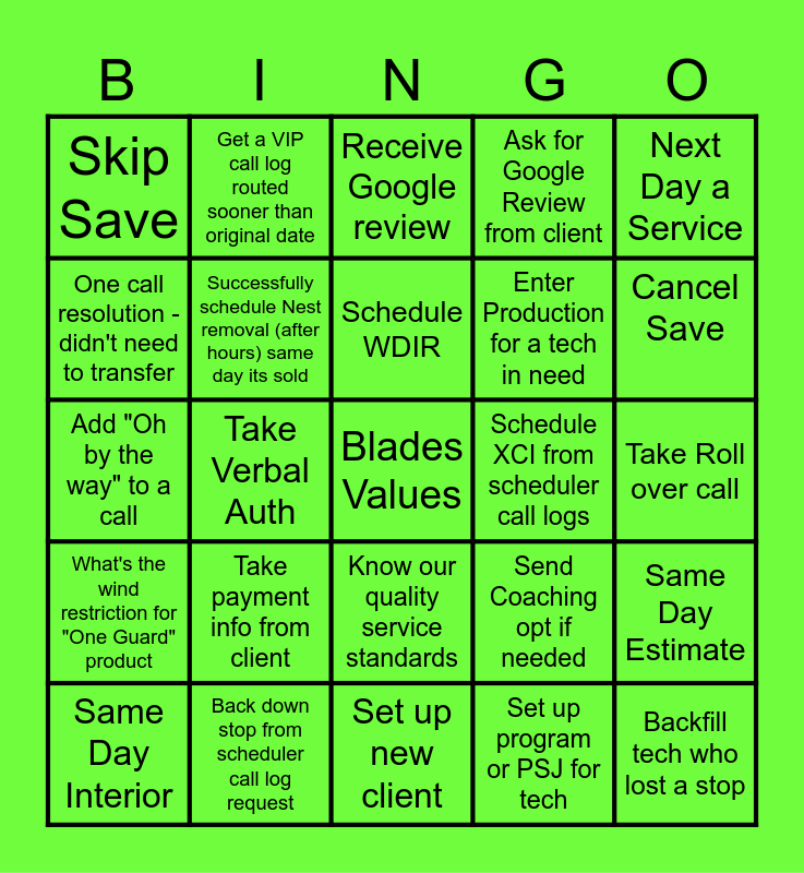 This bingo card has a free space and 24 words: Same Day Interior, Take payment info from client, Schedule WDIR, Set up program or PSJ for tech, Next Day a Service, Skip Save, Get a VIP call log routed sooner than original date, Receive Google review, Schedule XCI from scheduler call logs, Take Roll over call, Add "Oh by the way" to a call, Successfully schedule Nest removal (after hours) same day its sold, Send Coaching opt if needed, Same Day Estimate, One call resolution - didn't need to transfer, Back down stop from scheduler call log request, Set up new client, Ask for Google Review from client, Cancel Save, What's the wind restriction for "One Guard" product, Take Verbal Auth, Know our quality service standards, Enter Production for a tech in need and Backfill tech who lost a stop.