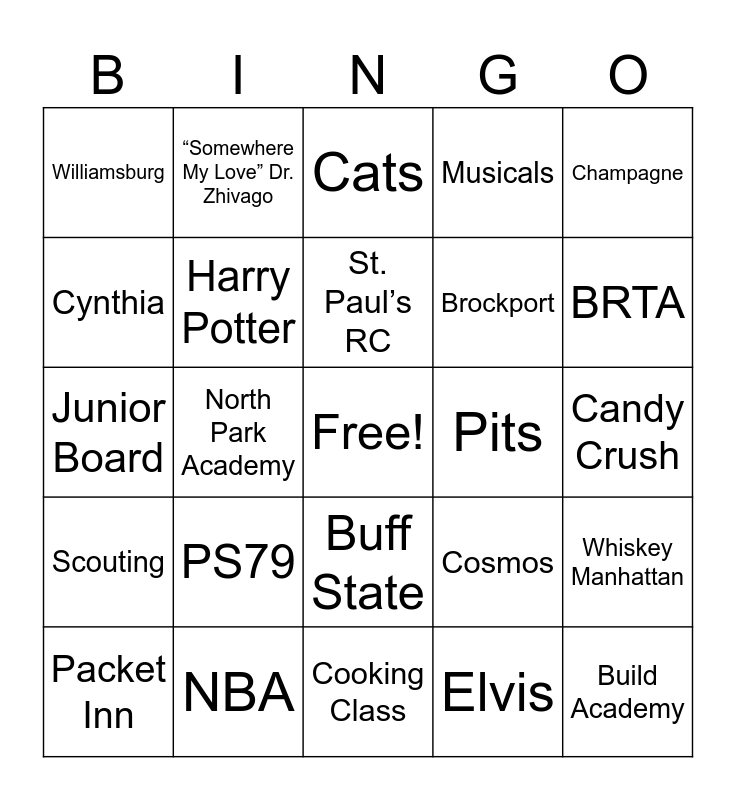 This bingo card has a free space and 24 words: PS79, NBA, St. Paul’s RC, Packet Inn, Champagne, Williamsburg, Cynthia, “Somewhere My Love” Dr. Zhivago, Pits, Buff State, Brockport, Junior Board, Cosmos, Whiskey Manhattan, Harry Potter, Elvis, Candy Crush, Cats, BRTA, North Park Academy, Build Academy, Scouting, Musicals and Cooking Class.