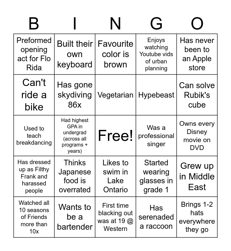 This bingo card has a free space and 24 words: Thinks Japanese food is overrated, Wants to be a bartender, Vegetarian, Watched all 10 seasons of Friends more than 10x, Has never been to an Apple store, Preformed opening act for Flo Rida, Can't ride a bike, Built their own keyboard, Was a professional singer, Likes to swim in Lake Ontario, Hypebeast, Used to teach breakdancing, Started wearing glasses in grade 1, Grew up in Middle East, Has gone skydiving 86x, Has serenaded a raccoon, Owns every Disney movie on DVD, Favourite color is brown, Can solve Rubik's cube, Had highest GPA in undergrad (across all programs + years), Brings 1-2 hats everywhere they go, Has dressed up as Filthy Frank and harassed people, Enjoys watching Youtube vids of urban planning and First time blacking out was at 19 @ Western.