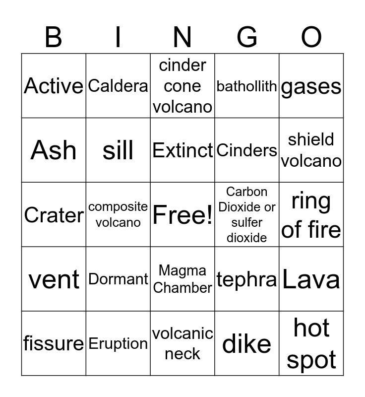 This bingo card has a free space and 24 words: Dormant, Eruption, Extinct, fissure, gases, Active, Ash, Caldera, Carbon Dioxide or sulfer dioxide, Magma Chamber, Cinders, Crater, tephra, Lava, sill, dike, ring of fire, cinder cone volcano, shield volcano, composite volcano, hot spot, vent, bathollith and volcanic neck.