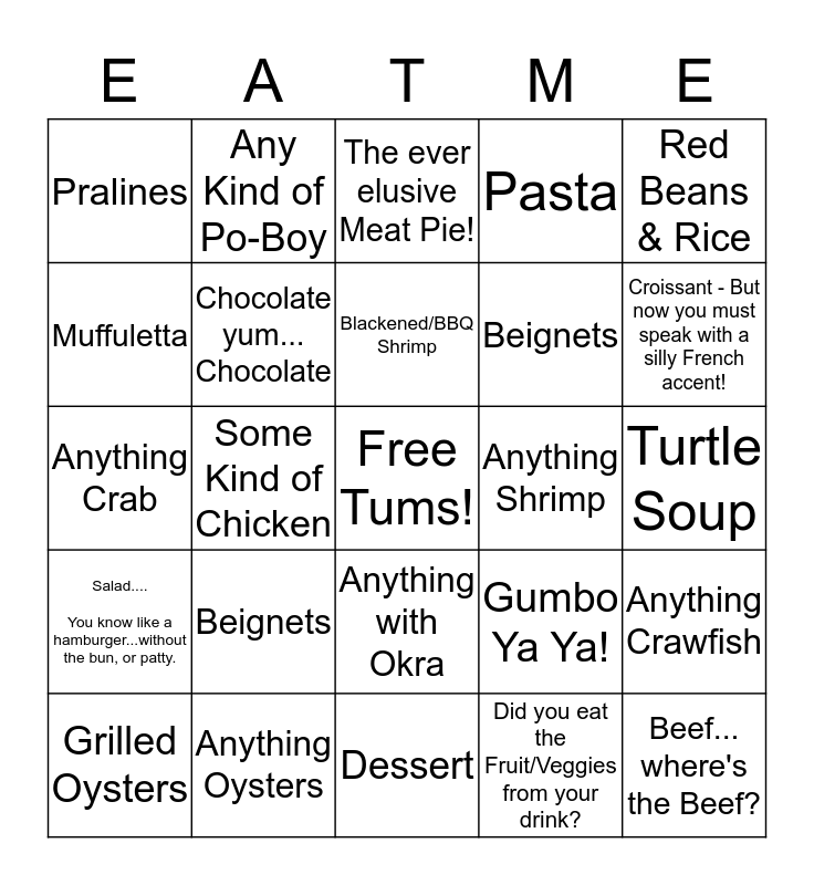 This bingo card has a free space and 24 words: Beignets, Anything Oysters, Blackened/BBQ Shrimp, Grilled Oysters, Red Beans & Rice, Pralines, Muffuletta, Any Kind of Po-Boy, Anything Shrimp, Anything with Okra, Beignets, Anything Crab, Gumbo Ya Ya!, Anything Crawfish, Chocolate yum... Chocolate, Did you eat the Fruit/Veggies from your drink?, Turtle Soup, The ever elusive Meat Pie!, Croissant - But now you must speak with a silly French accent!, Some Kind of Chicken, Beef... where's the Beef?, Salad.... You know like a hamburger...without the bun, or patty., Pasta and Dessert.