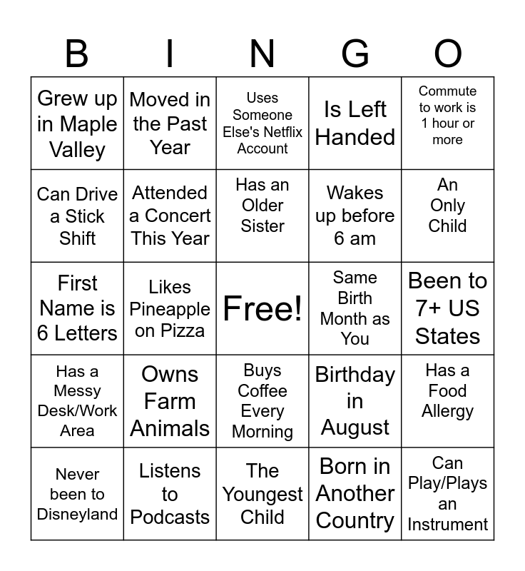 This bingo card has a free space and 24 words: Owns Farm Animals, Listens to Podcasts, Has an Older Sister, Never been to Disneyland, Commute to work is 1 hour or more, Grew up in Maple Valley, Can Drive a Stick Shift, Moved in the Past Year, Same Birth Month as You, Buys Coffee Every Morning, Wakes up before 6 am, First Name is 6 Letters, Birthday in August, Has a Food Allergy, Attended a Concert This Year, Born in Another Country, Been to 7+ US States, Uses Someone Else's Netflix Account, An Only Child, Likes Pineapple on Pizza, Can Play/Plays an Instrument, Has a Messy Desk/Work Area, Is Left Handed and The Youngest Child.