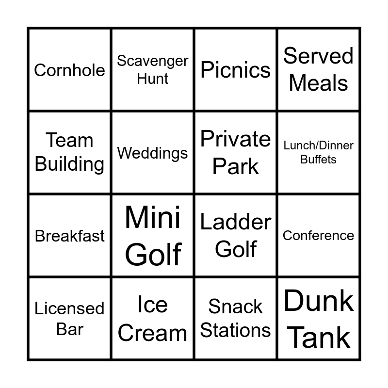 This bingo card has 20 words: Conference, Meetings, Picnics, Magician, Licensed Bar, Team Building, Ice Cream, Cornhole, Breakfast, Scavenger Hunt, Mini Golf, Ladder Golf, Weddings, Dunk Tank, Private Park, Weekday Catering, Lunch/Dinner Buffets, Served Meals, Snack Stations and Dessert.