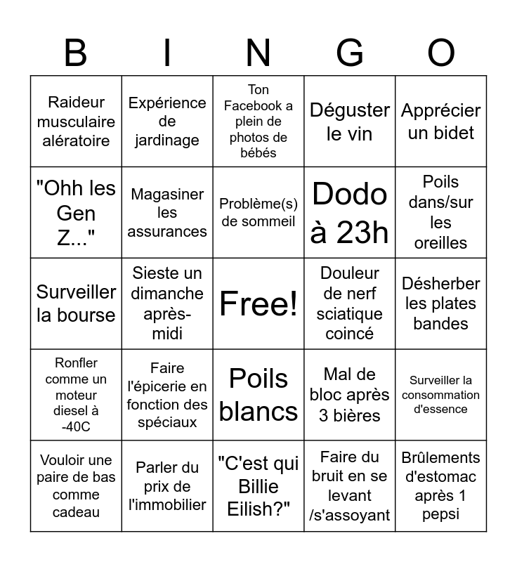 This bingo card has a free space and 24 words: Faire l'épicerie en fonction des spéciaux, Parler du prix de l'immobilier, Problème(s) de sommeil, Vouloir une paire de bas comme cadeau, Apprécier un bidet, Raideur musculaire alératoire, "Ohh les Gen Z...", Expérience de jardinage, Douleur de nerf sciatique coincé, Poils blancs, Dodo à 23h, Surveiller la bourse, Mal de bloc après 3 bières, Surveiller la consommation d'essence, Magasiner les assurances, Faire du bruit en se levant /s'assoyant, Désherber les plates bandes, Ton Facebook a plein de photos de bébés, Poils dans/sur les oreilles, Sieste un dimanche après-midi, Brûlements d'estomac après 1 pepsi, Ronfler comme un moteur diesel à -40C, Déguster le vin and "C'est qui Billie Eilish?".