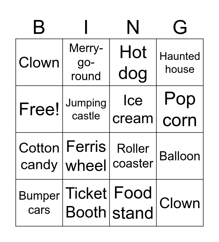 This bingo card has 16 words: Ticket Booth, Balloon, Hot dog, Clown, Cotton candy, Merry-go- round, Roller coaster, Food stand, Free!, Jumping castle, Bumper cars, Haunted house, Ferris wheel, Pop corn, Ice cream and Clown.