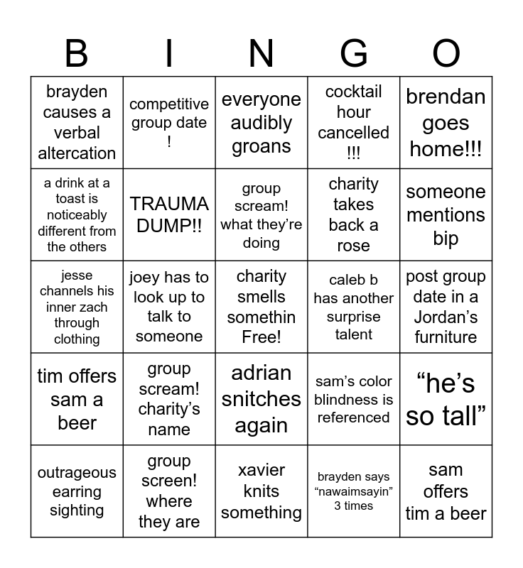 This bingo card has a free space and 24 words: group scream! charity’s name, group screen! where they are, group scream! what they’re doing, outrageous earring sighting, brendan goes home!!!, brayden causes a verbal altercation, a drink at a toast is noticeably different from the others, competitive group date !, caleb b has another surprise talent, adrian snitches again, charity takes back a rose, jesse channels his inner zach through clothing, sam’s color blindness is referenced, “he’s so tall”, TRAUMA DUMP!!, brayden says “nawaimsayin” 3 times, post group date in a Jordan’s furniture, everyone audibly groans, someone mentions bip, joey has to look up to talk to someone, sam offers tim a beer, tim offers sam a beer, cocktail hour cancelled !!! and xavier knits something.