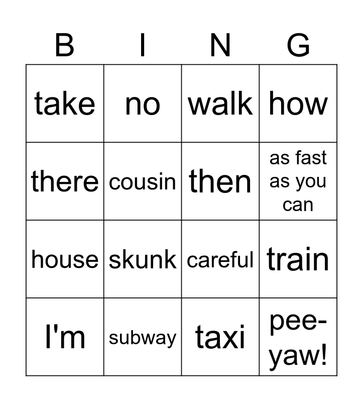 This bingo card has 16 words: subway, train, walk, take, house, no, careful, taxi, there, cousin, I'm, how, skunk, as fast as you can, then and pee-yaw!.