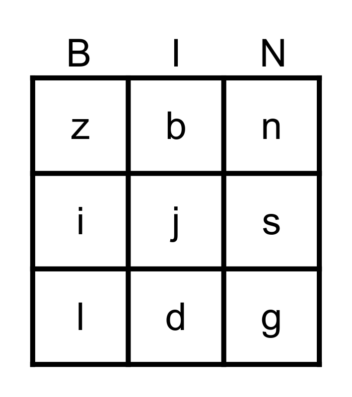 This bingo card has a free space and 8 words: s, n, b, l, z, g, i and d.
