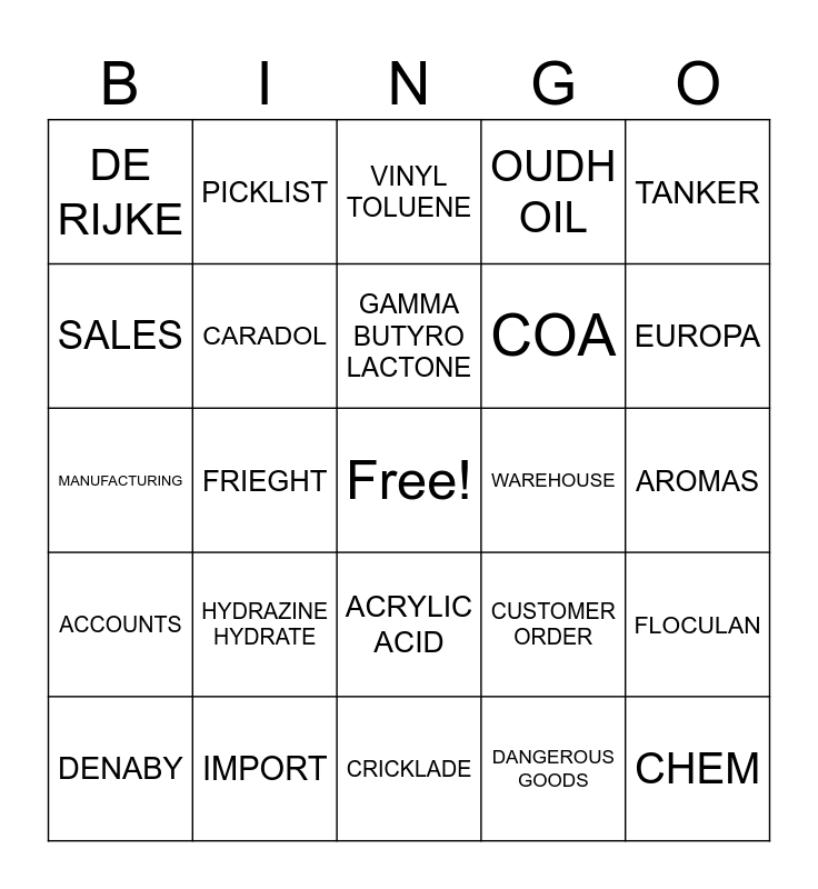 This bingo card has a free space and 37 words: COCONUT OIL, LANSANTOL, CRUDE IODINE, CARADOL, FLOCULAN, HYDRAZINE HYDRATE, GAMMA BUTYRO LACTONE, LANCOS EM-40, TANKER, PALLETS, FRIEGHT, OUDH OIL, CHEM, AROMAS, SALES, ACCOUNTS, PERS, VINYL TOLUENE, ACRYLIC ACID, WAREHOUSE, DE RIJKE, EUROPA, DENABY, CRICKLADE, BOL, DANGEROUS GOODS, PICKLIST, ORIGIN, IFS CLOUD, SHAREPOINT, EXPORT, IMPORT, MANUFACTURING, SHOP ORDER, CUSTOMER ORDER, COA and COMMERCIAL INVOICE.