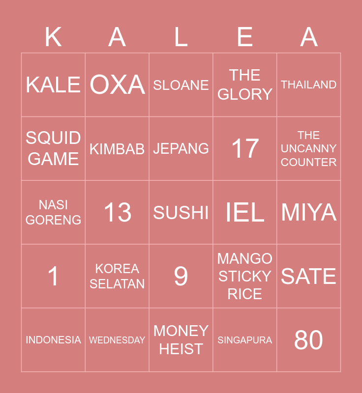 This bingo card has a free space and 24 words: INDONESIA, KOREA SELATAN, JEPANG, SINGAPURA, THAILAND, KALE, OXA, SLOANE, IEL, MIYA, NASI GORENG, KIMBAB, MANGO STICKY RICE, SATE, SQUID GAME, WEDNESDAY, MONEY HEIST, THE GLORY, THE UNCANNY COUNTER, 1, 13, 9, 17 and 80.