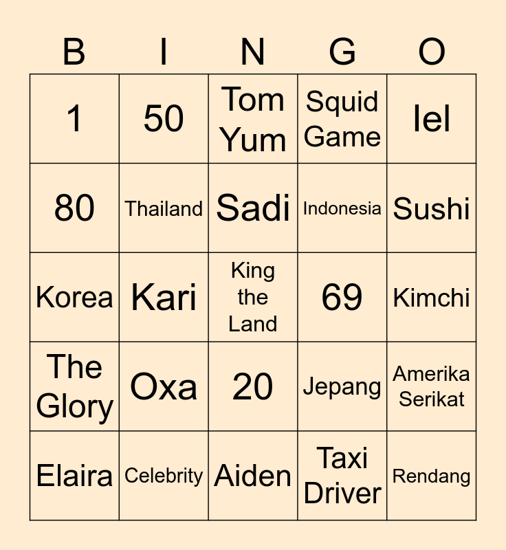 This bingo card has 25 words: Oxa, Aiden, Sadi, Elaira, Iel, 1, 80, 50, 69, 20, Indonesia, Korea, Jepang, Amerika Serikat, Thailand, Rendang, Kimchi, Tom Yum, Sushi, Kari, King the Land, Celebrity, The Glory, Squid Game and Taxi Driver.
