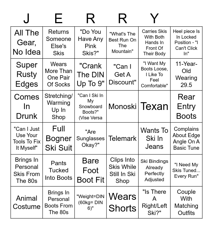 This bingo card has 49 words: Jerry Gap, Comes In Drunk, Backwards Helmet, Wants To Ski In Jeans, Texan, Clips Into Skis While Still In Ski Shop, Returns Someone Else's Skis, "I Don't Need A Helmet, I Don't Fall", Heel piece Is In Locked Position - "I Can't Click In", Brings In Personal Boots From The 80s, Super Rusty Edges, "What's The Best Run On The Mountain", Full Bogner Ski Suit, "Can I Just Use Your Tools To Fix It Myself", "I Was Just Skiing Along And It Broke", Bare Foot Boot Fit, Wears More Than One Pair Of Socks, Stretching/ Warming Up In Shop, Wears Goggles Upside Down, Carries Skis With Both Hands In Front Of Their Body, 11-Year-Old Wearing 29.5, Complains About Edge Angle On A Basic Tune, All The Gear, No Idea, "Crank The DIN Up To 9", Brings In Terribly Damaged Skis, "Can I Get A Discount", "Are Sunglasses Okay?", Skis Without Eyewear, Rear Entry Boots, Monoski, Bent Pole, Pants Tucked Into Boots, Couple With Matching Outfits, Wants To Buy A Single Pole, Telemark, "Weight=DIN (60kg= DIN 6)", Wears Shorts, "Is There A Right/Left Ski?", "Can I Ski In My Snowboard Boots?" (Vise Versa, Animal Costume, Demands A Refund Because They Didn't Like It, Ski Bindings Already Perfectly Adjusted, Brings In Personal Skis From The 80s, "I Want The Most Expensive Skis You Have", "I Want My Boots Loose, I Like To Feel Comfortable", "Do You Have Any Pink Skis?", Working While Hungover, "I Need My Skis Tuned... Every Run" and Slope Condition Critic.