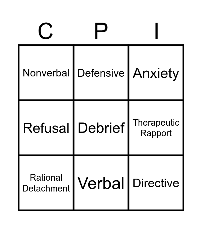 This bingo card has 28 words: Welfare, Supportive, Directive, Safety Interventions, Therapeutic Rapport, Anxiety, Defensive, Risk Behavior, Tension Reduction, Pacing, Listening, Refusal, Self-Injury, Teamwork, Apologize, Future Safety Plan, Integrated Experience, Rational Detachment, Verbal, Paraverbal, Nonverbal, Appears Nonthreatening, Windows of time, Remove dangerous items, Push/Pull, Severity, Debrief and Fail Safe Choice.