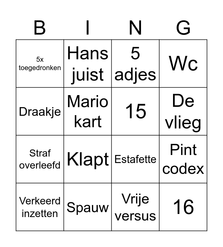This bingo card has 16 words: Spauw, Pint codex, 5 adjes, 5x toegedronken, Straf overleefd, Hans juist, Estafette, Vrije versus, Draakje, Mario kart, Verkeerd inzetten, Wc, Klapt, De vlieg, 15 and 16.